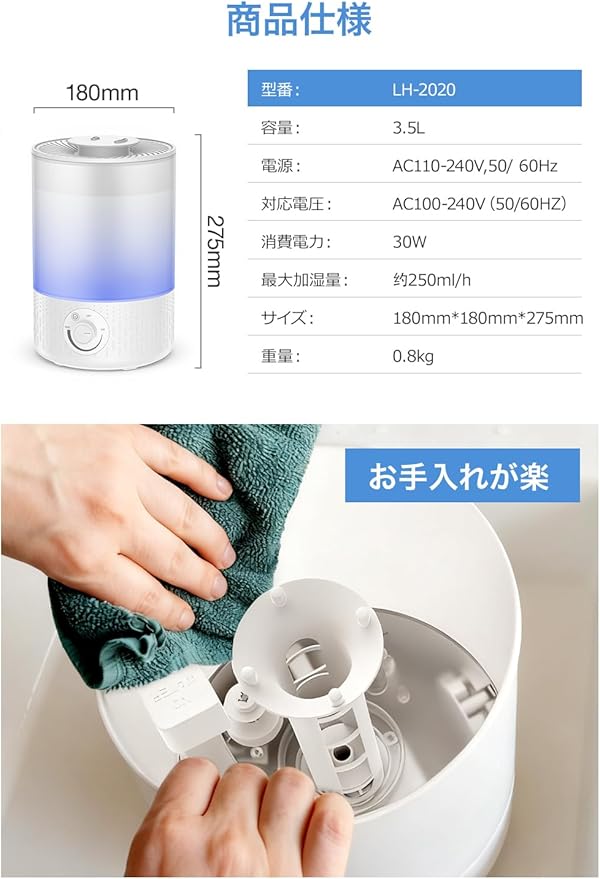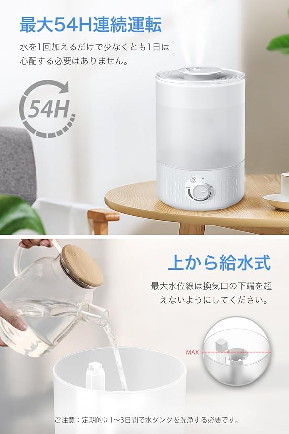 【超音波式加湿器・3.5L大容量・2025新一体化設計!】タンクと台座が一体化した設計で、しっかりと水漏れを防止しています。今年の改良点は、蓋と中軸導管を一体化した独自構造です。従来の分離式に比べて加湿の安定性がさらに向上しました。3.5Lの大容量タンクを搭載し、家庭の寝室やリビングルームはもちろん、広いオフィス空間にも最適です。(ご注意:MAX以上給水するとミストが少なくなったり出なくなる原因になるため注意してください。集エネルギー環の上下位置を逆さまにしないようにご注意ください)