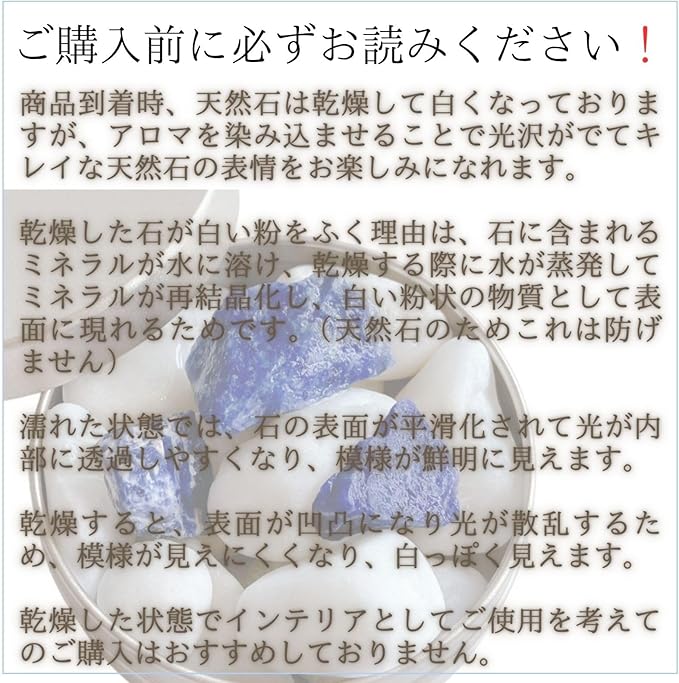 商品到着時天然石は乾燥して白くなっていますがアロマをたらせば光沢がでてキレイな天然石の表情をお楽しみになれます。乾燥した石が白い粉をふく理由は、石に含まれるミネラルが水に溶け、乾燥する際に水が蒸発してミネラルが再結晶化し、白い粉状の物質として表面に現れるためです。