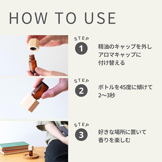 エッセンシャルオイル(精油)瓶のキャップと付け替え、瓶をそっと傾けると優しくアロマが広がります。