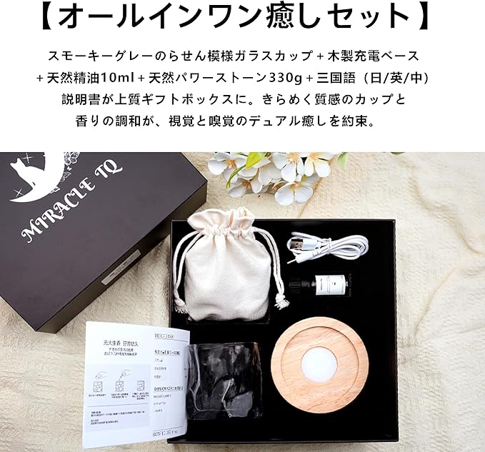 【オールインワン癒しセット】 スモーキーグレーのらせん模様ガラスカップ+木製充電ベース+天然精油10ml+ピンク水晶330g+三国語(日/英/中)説明書が上質ギフトボックスに。きらめく質感のカップと香りの調和が、視覚と嗅覚のデュアル癒しを約束。