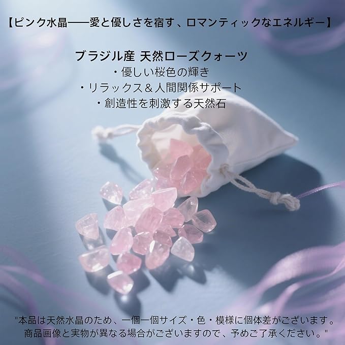 【ピンク水晶——愛と優しさを宿す、ロマンティックなエネルギー】 ブラジル産の天然ピンク水晶は、柔らかなピンク色の輝きで、見る者の心を温かく包み込みます。手に取れば、その優しいエネルギーがストレスを溶かし、人間関係の調和を促します。恋愛運アップのパワーストーンとして知られ、またクリエイティブなインスピレーションを刺激する——まさに、心に潤いを与える宝石です。