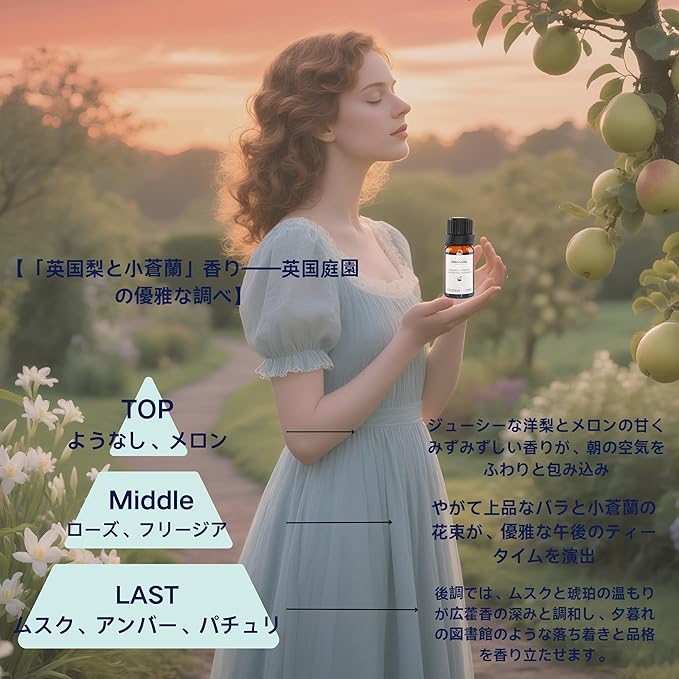 【「英国梨と小蒼蘭」香り——英国庭園の優雅な調べ】 ジューシーな洋梨とメロンの甘くみずみずしい香りが、朝の空気をふわりと包み込み、やがて上品なバラと小蒼蘭の花束が、優雅な午後のティータイムを演出。後調では、ムスクと琥珀の温もりが広藿香の深みと調和し、夕暮れの図書館のような落ち着きと品格を香り立たせます。この香りは、オフィスでは洗練された雰囲気を、自宅ではくつろぎのひとときを——まるで英国の田園地帯を散策するような、上質な時間を約束します。