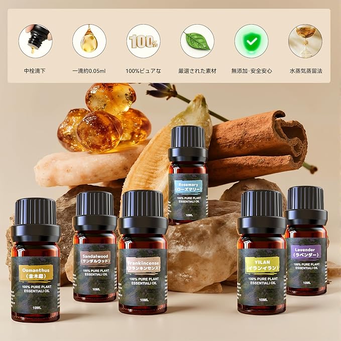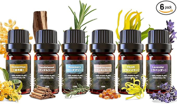 【仕様】容量:10ml*6 ♦︎容器:遮光茶色ガラス瓶 ♦︎香りの系統:ラベンダー/イランイラン/金木犀/フランキンセンス/ローズマリー/サンダルウッド ♦︎ドロッパー(滴下)式、1滴は約0.05ml、DIYの時に使う分量がうまく把握できます。