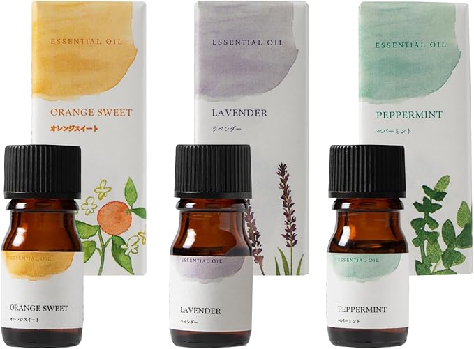 セット内容: オレンジスイート、ラベンダー、ペパーミントの精油3種類、各5mlのお得なセット