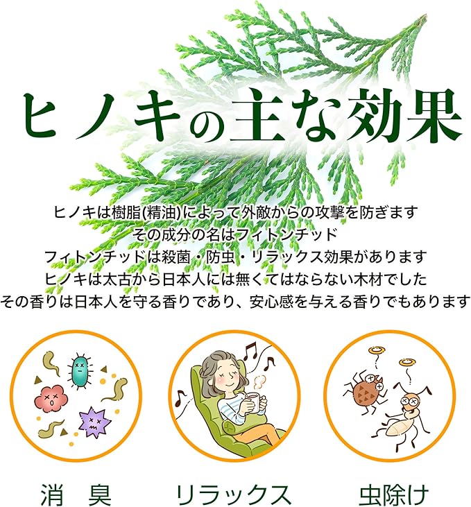 ひのき・ヒバは他の木に比べ、高い防菌・防カビ・防虫効果を持っているといわれています。 それぞれに含まれているフィットンチッドやヒノキチオールがカビの増殖を抑えたり、ダニや白アリの活動を抑制します。
