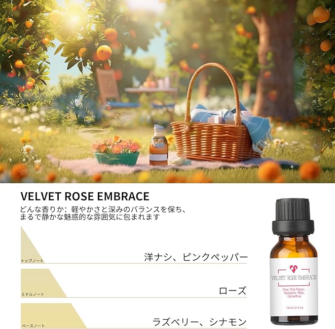 「Velvet Rose Embrace」アロマオイル:洋ナシ、ピンクペッパー、ラズベリー、ローズ、シナモンをベースにして、甘く豊かで、軽やかさとロマンスを醸し出し、リラックスした気分を楽しめるようです。 明るさと繊細さを併せ持ち、庭園や果癒しグッズ プレゼント 女性 男性 快眠 安眠 グッズ リラックス 香り アロマ アロマオイル セット エッセンシャルオイル アロマ 精油 アロマディフューザー 車 アロマウッド アロマストーン アロマスプレー アロマポット 茶香炉 加湿 器 無水エタノール 樹園が織りなす芳しい世界を歩い、穏やかで幻想的な雰囲気を漂わせます