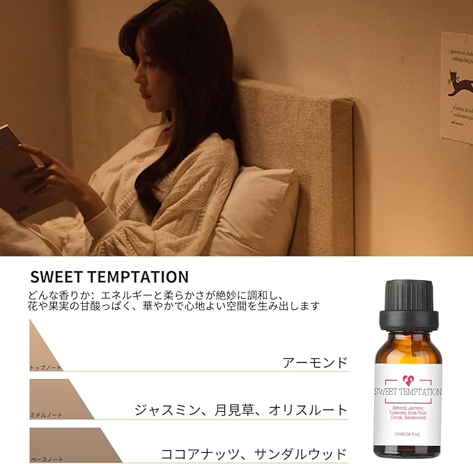 「Sweet Temptation」アーモンド、ジャスミン、月見草、オリスルート、ココアナッツ、サンダルウッドをベースにして、アーモンドの甘さ、ジャスミンの優雅さ、チュベローズの華やかさ、オリスの繊細さ、カカオの豊かさ、サンダルウッドの深みが調和し、ソフトなフローラルから温かみのあるウッドまで、豊かで心地よい香りが広がります