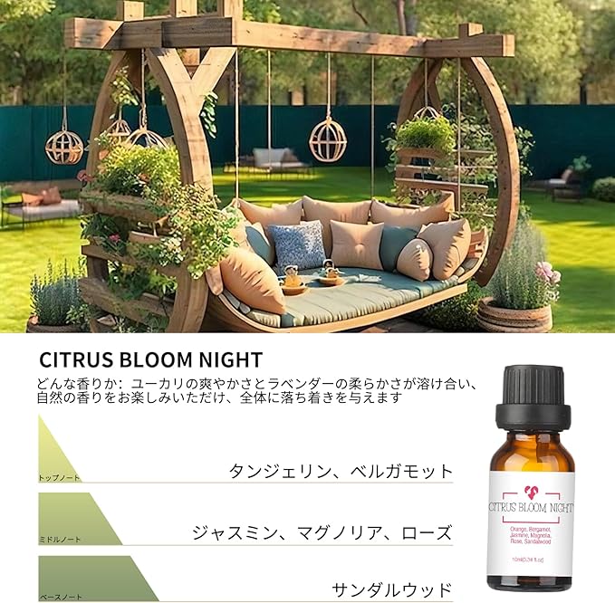 「Citrus Bloom Night」タンジェリン、ベルガモット、ジャスミン、マグノリア、ローズ、サンダルウッドをベースにして、フレッシュでフルーティーな香りは、爽やかな初夏の空気のように、生き生きとした朝を感じられます。 優しい花の香りは漂い、最後ウッディノートが包み込み、深みと温かみを加えます