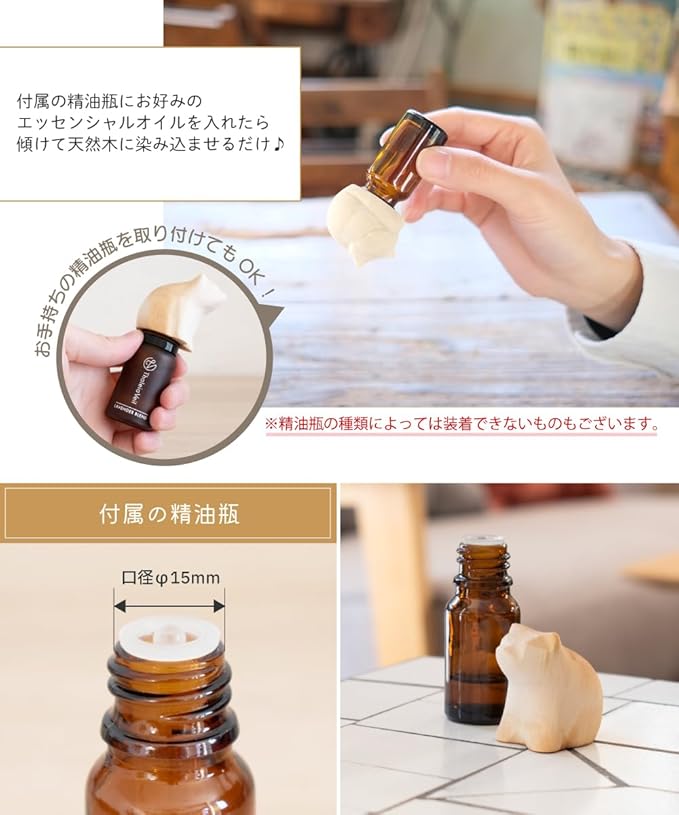 ✅『火も水も電気も使わないお手軽アロマ』付属の精油瓶にお好みのエッセンシャルオイルを入れるか、お手持ちの精油瓶を取り付けて、ボトルをそっと傾けるだけ。天然木にエッセンシャルオイルが染み込んで、枕元やデスクなどのパーソナルスペースに優しく香りが広がります。
