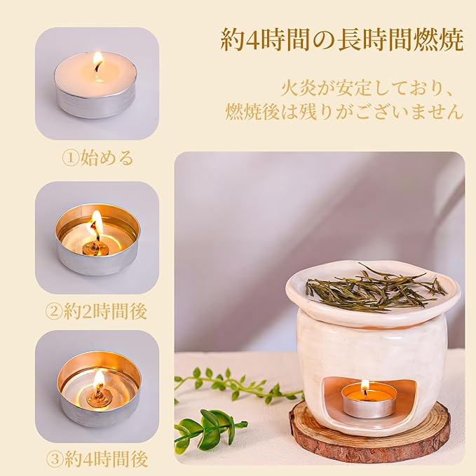 【用途が広く、多様な場面に適合】本製品は 100 個入りの仕様となっており、家庭から業務用途まで、さまざまな場面でご使用いただけます。茶香炉やアロマファンと併用する場合、仏壇への供奉、教会での祈り、さらには緊急時の防災用途など、どのような場面にもスムーズに適応いたします。長持ちする上に、量が多く経済的であり、さまざまな場面のニーズにお応えいたします。