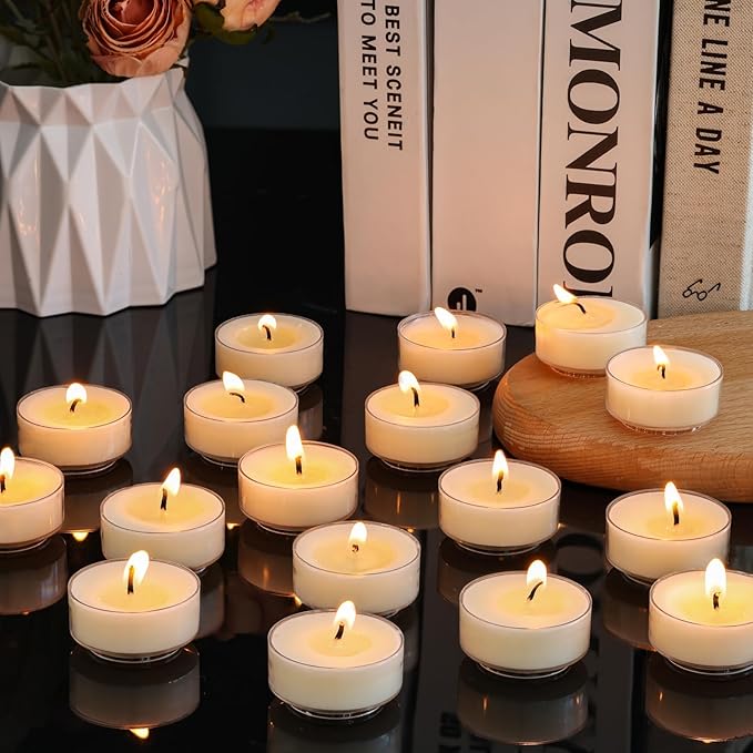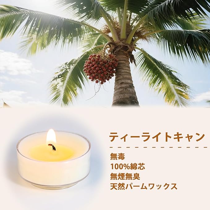 【天然植物成分で、安全かつ負担なし】LETINEのティーライトキャンドルは天然パームワックスと 100% 綿製の芯を使用しています。燃焼時にも有害物質を放出しにくく、お子様がいらっしゃるご家庭やペットをお飼いのご家庭でも安心してご使用いただけます。100% 綿製の芯は燃焼が安定し、無煙で環境に優しく、使用時の安全性と快適さを大幅に高めます。