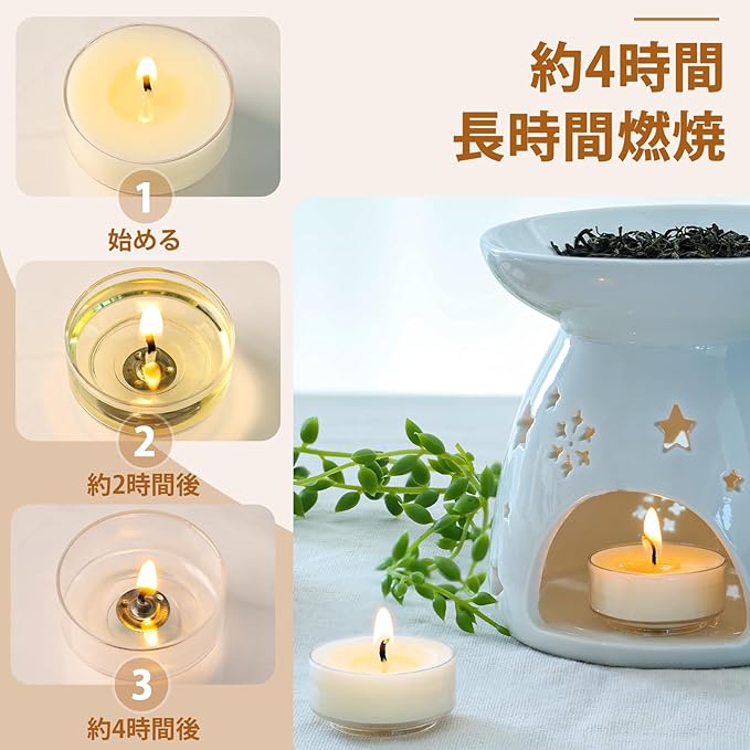 【無臭で香料無添加、様々なシーンに対応】これらのろうそくは燃焼時に臭いがしませんので、加熱する物体本来の香りを妨げることがありません。香り料・香料・人工フレグランスを一切添加しておりません。そのため、鼻炎の方やアレルギー体質の方でも安心してご使用いただけます。茶香炉やアロマポットと組み合わせて使用する場合、防災応急や儀式イベント、さらにレストランでの食材保温などのシーンでも、スムーズに対応できます。長持ちして経済的なため、様々なニーズを満たすことができます。