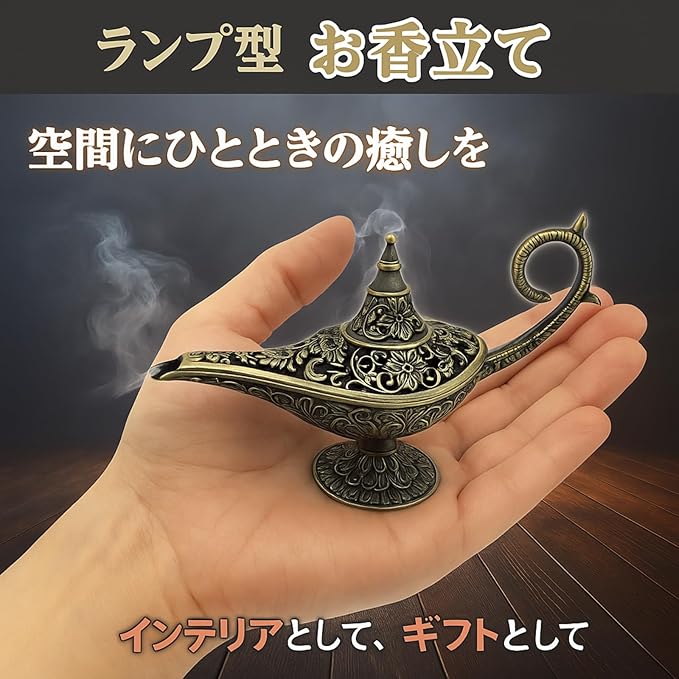 ランプ型のお香立ては、香りと共に癒しのひとときを演出します。デザイン性にも優れており、エキゾチックなデザインが和洋問わずさまざまな空間に馴染みます。手のひらサイズで置く場所を選ばないのもポイントです。