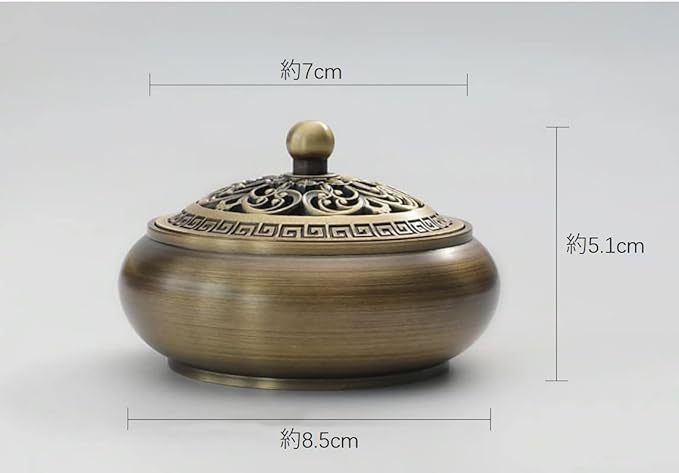 サイズ(約):胴径8.5cm、口径 7cm、高さ5.1cm。重量:約200g。セット:香炉x1、蓋x 1、お香立てx1、不燃布x1.