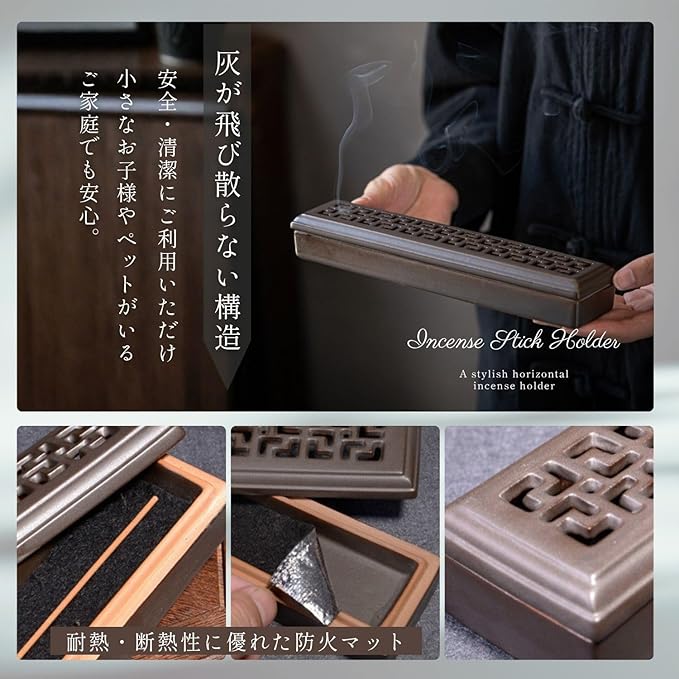灰が飛び散らない安心構造:横置き+蓋付き設計により、燃焼中の灰が風に舞って周囲を汚す心配がありません。従来の立てる線香とは違い灰受けが不要で後片付けも簡単!蓋をしたままでも煙がほんのり漏れる構造で、香りだけをしっかりお楽しみいただけます。エアコンの風が当たる場所でも灰が飛び散らず、安全・清潔にご利用いただけます。