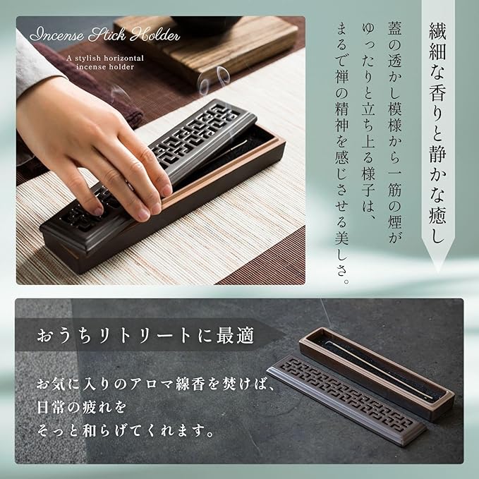 繊細な香りと静かな癒し:蓋の透かし模様から一筋の煙がゆったりと立ち上る様子は、まるで禅の精神を感じさせる美しさ。お気に入りのアロマ線香を焚けば、お部屋中に癒しの香りが広がり日常の疲れをそっと和らげてくれます。視覚と嗅覚でリラックス効果を楽しめる、おうちリトリートに最適なアイテムです。