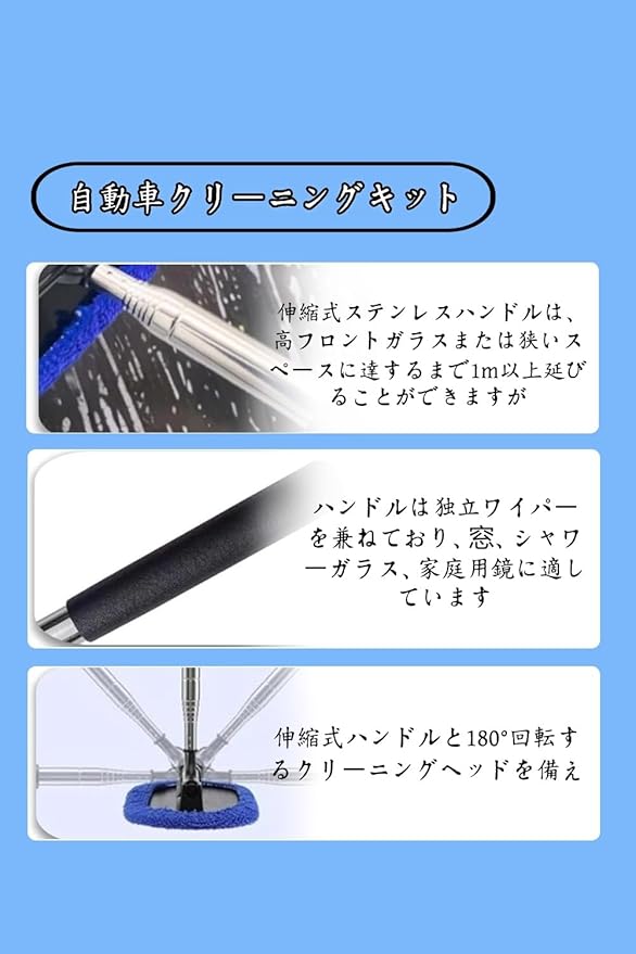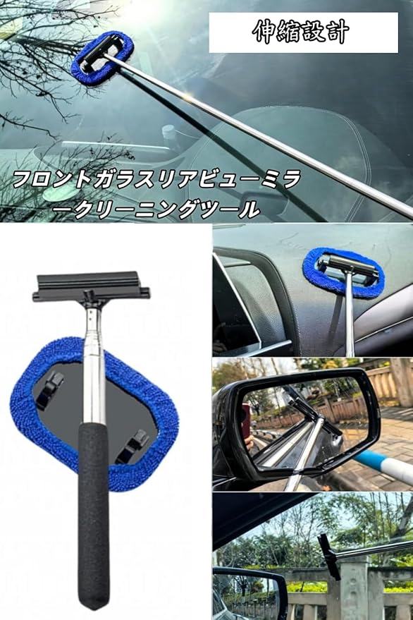 【製品の詳細】伸縮可能な自動車バックミラーワイパー*1個、交換可能な超微細繊維マット*2個。この使いやすいフロントガラスクリーニングツールは、日常の自動車クリーニングニーズを簡単に満たします。