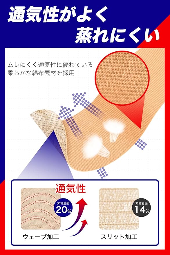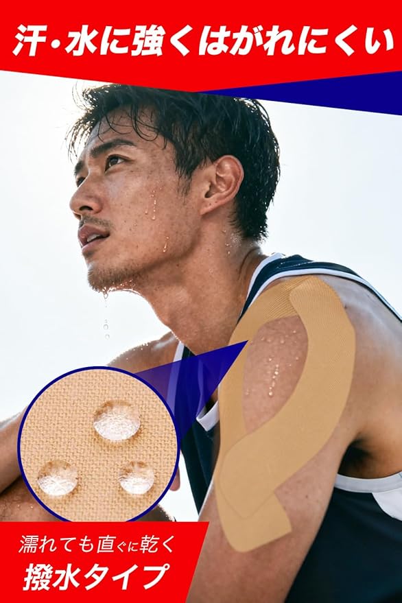 【汗・水に強い撥水粘着】撥水加工により、汗や水に濡れてもはがれにくく長時間の粘着力をキープ。雨の日や汗をかく運動中でも剥がれにくく、安心してスポーツに集中できます。