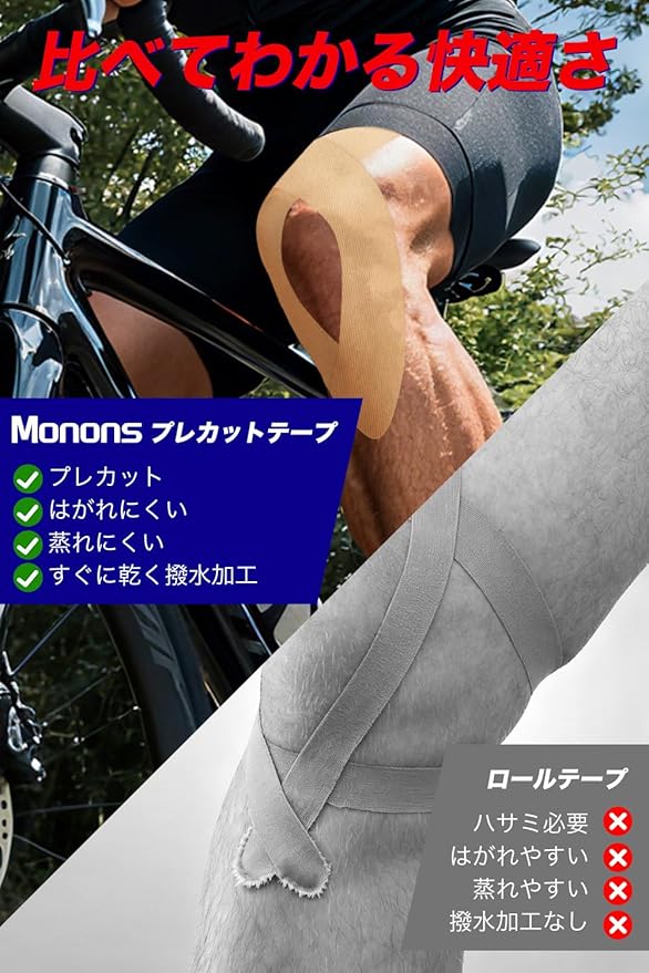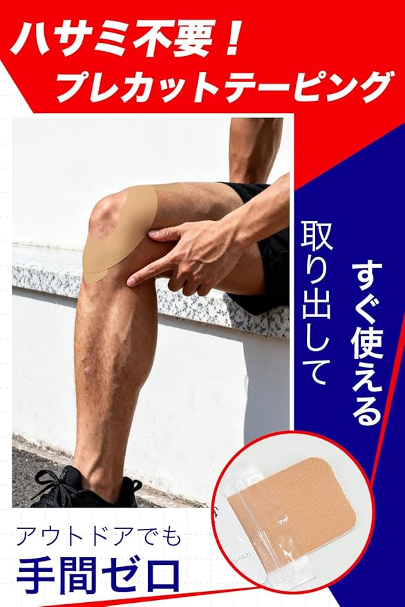 【ハサミ不要!プレカットタイプ】あらかじめカットされたプレカットテーピングテープなので、ハサミ不要でサッと使える。初心者でも簡単に扱える仕様で、ロールタイプよりも使いやすく、アウトドアやランニング、ジョギング、トレーニング前後などのシーンに最適です。