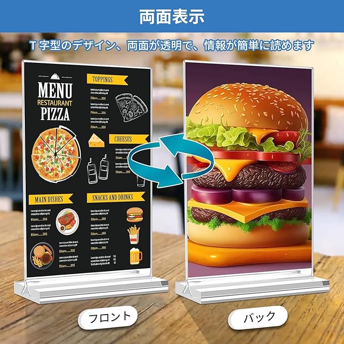 【超鮮明透明】:メニューや印刷材料などを鮮明に表示し、印刷された色も精巧に表示できる高透明アクリル看板スタンドです。両面がはっきりと表示され、アクリル板の厚さは4ミリで、耐久性、耐久性、優れた耐衝撃性を持ち、破裂しにくい。