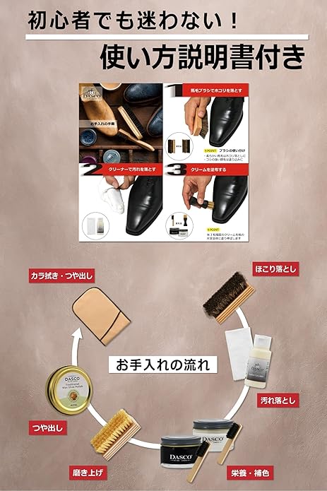 【初心者でも安心。みがき方ガイド】写真入りでわかりやすいガイドで、初心者でも迷わず使用できます。プロのような鏡面仕上げができるポリッシュまで入って、靴磨き上級者も満足。