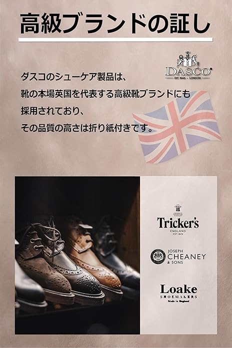 【高級靴限定商品でも採用】ダスコの靴クリームは、厳選された天然原料をおしみなく配合。伝統的な製法とレシピで作られています。そのクオリティーと仕上がりの美しさは、数多の最高級靴限定商品に採用されています。