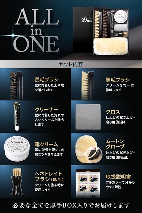 [DABLOCKS] 靴磨きセット 馬毛、豚毛ブラシ付き かんたんお手入れ