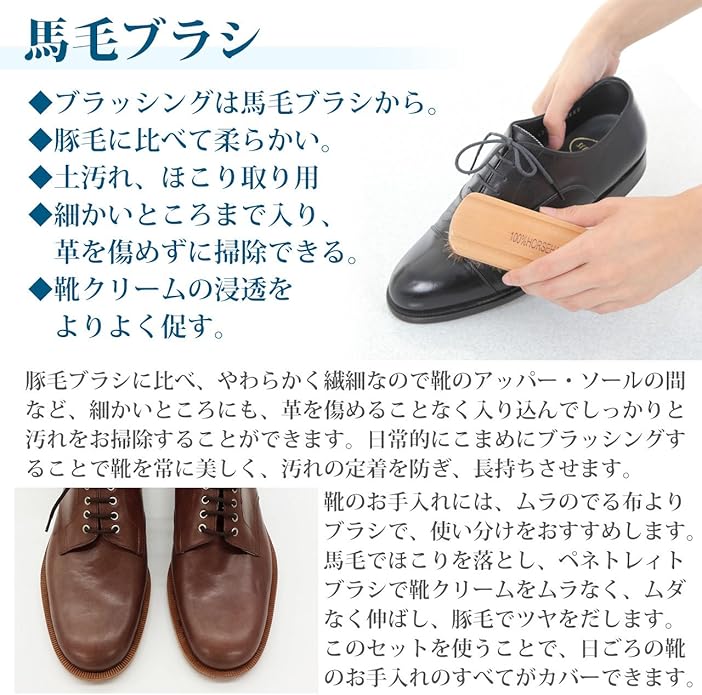 埃落としから艶出しまで靴のお手入れに必要なブラシが揃ったお得なセットです