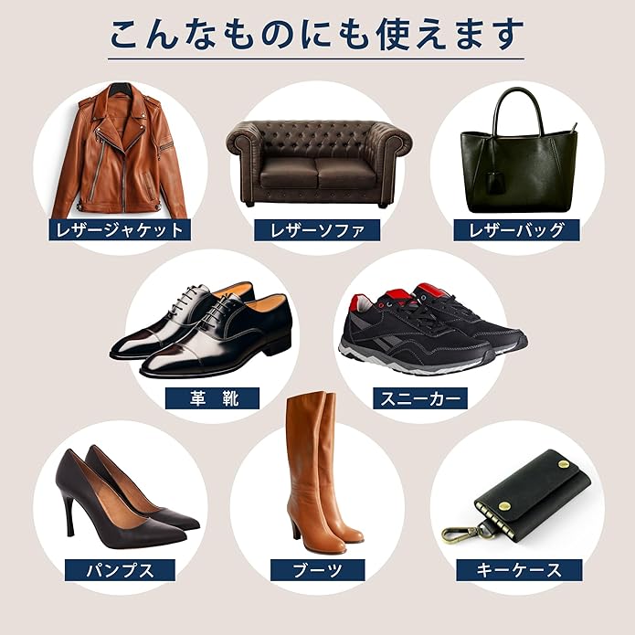 【簡単3ステップケア】埃落とし→汚れ落とし・栄養補給→ツヤ出し仕上げ:①馬毛ブラシで埃落とし ②オールインワンレザーローションで汚れ除去と革への栄養補給 ③クロスで乾拭きしてツヤ出し完了。この3ステップで革靴・バッグ・ジャケット・ソファなど幅広いレザー製品が新品同様の美しさに蘇ります。専門知識不要で誰でも簡単にプロ級の仕上がりを実現できます。
