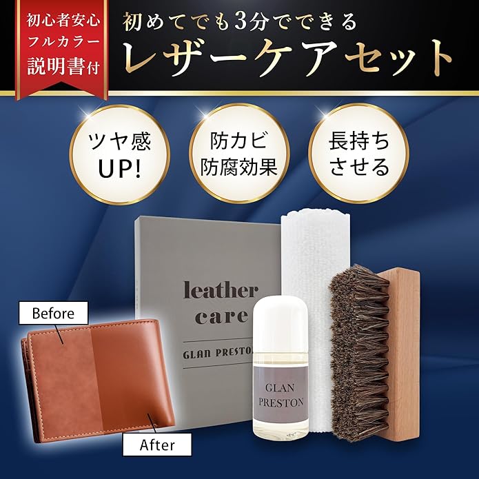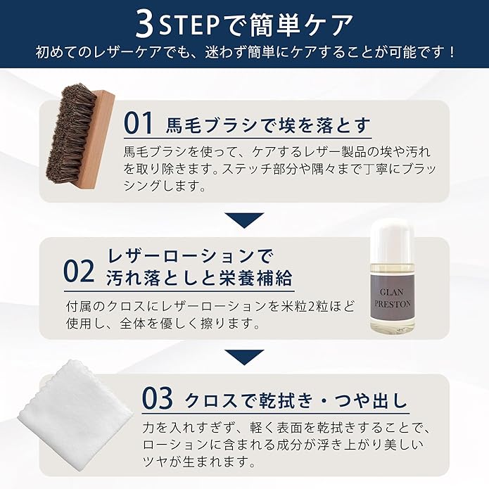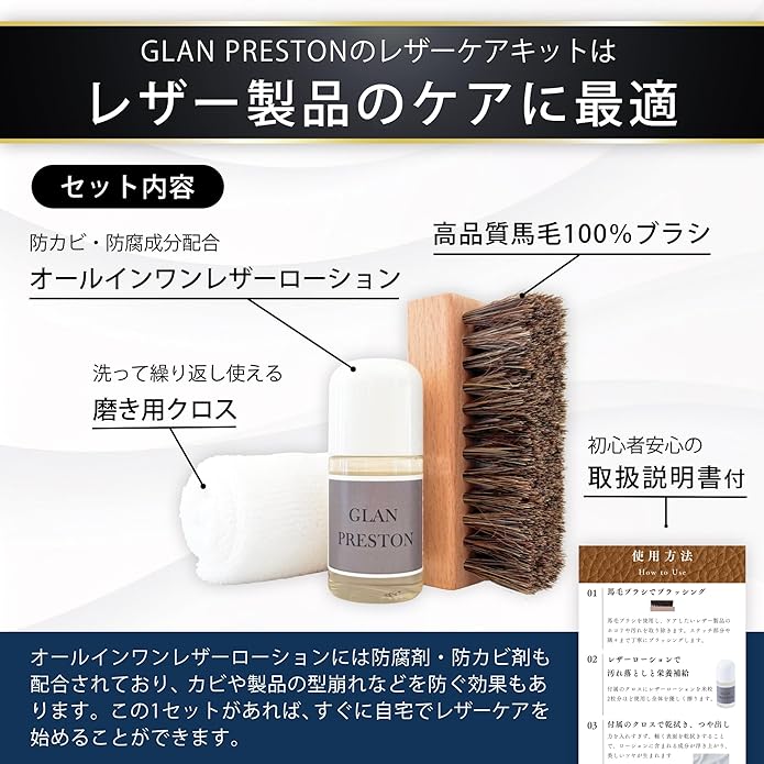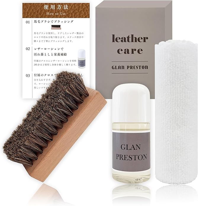 【初心者でも3分で革製品のケアが完了】日本製オールインワンレザーローション:革の汚れ落としと栄養補給が1本で可能な画期的なレザーケアセット。従来の2工程が1工程に短縮され、初めてのレザーケアでも簡単にツヤ感アップと防カビ・防腐効果を実現。高品質馬毛ブラシ、磨き用クロス、フルカラー取扱説明書付きで届いたその日からプロ級のケアが始められます。 【時短革命】オールインワンローションで従来の半分の時間でケア完了:一般的なレザーケアはクリーナーとクリームの2本使いで手間と時間がかかりますが、GLAN PRESTONのオールインワンレザーローションなら汚れ落とし・栄養補給・ツヤ出しが1本で完結。忙しい現代人にピッタリの革新的なレザーケア用品で、大切な革製品を効率的にメンテナンス可能です。 【プロ仕様セット内容】高品質馬毛ブラシ+オールインワンレザーローション(防カビ・防腐成分配合ローション)+磨き用クロス+フルカラーレザーケア説明書:馬毛100%ブラシで埃を優しく除去、オールインワンレザーローションで汚れ落とし・栄養補給、専用クロスでツヤ出し仕上げの完璧な3点セット。防腐剤・防カビ剤配合でカビや型崩れを防止し、革製品の寿命を大幅に延長。初心者安心のフルカラー説明書付きで失敗知らずのレザーケアを実現します。 【簡単3ステップケア】埃落とし→汚れ落とし・栄養補給→ツヤ出し仕上げ:①馬毛ブラシで埃落とし ②オールインワンレザーローションで汚れ除去と革への栄養補給 ③クロスで乾拭きしてツヤ出し完了。この3ステップで革靴・バッグ・ジャケット・ソファなど幅広いレザー製品が新品同様の美しさに蘇ります。専門知識不要で誰でも簡単にプロ級の仕上がりを実現できます。 【多用途対応】革靴・バッグ・ジャケット・ソファまで幅広いレザー製品に対応:スムースレザー全般に使用可能で、革靴・ブーツ・スニーカー・パンプス・レザーバッグ・レザージャケット・レザーソファ・財布・キーケースなど様々な革製品のケアに最適。1セットあれば家中のレザー製品をトータルケアでき、GLAN PRESTONの信頼の日本製品質で大切な革製品を長期間美しく保護します。 【使用不可素材】起毛革(スエード、ヌバック、バックスキン、ベロア等、ヌメ革、エナメル革、は虫類、オーストリッチ等の特殊皮皮製品