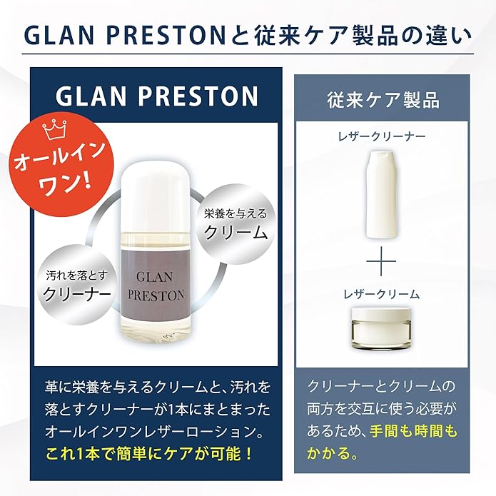 【時短革命】オールインワンローションで従来の半分の時間でケア完了:一般的なレザーケアはクリーナーとクリームの2本使いで手間と時間がかかりますが、GLAN PRESTONのオールインワンレザーローションなら汚れ落とし・栄養補給・ツヤ出しが1本で完結。忙しい現代人にピッタリの革新的なレザーケア用品で、大切な革製品を効率的にメンテナンス可能です。