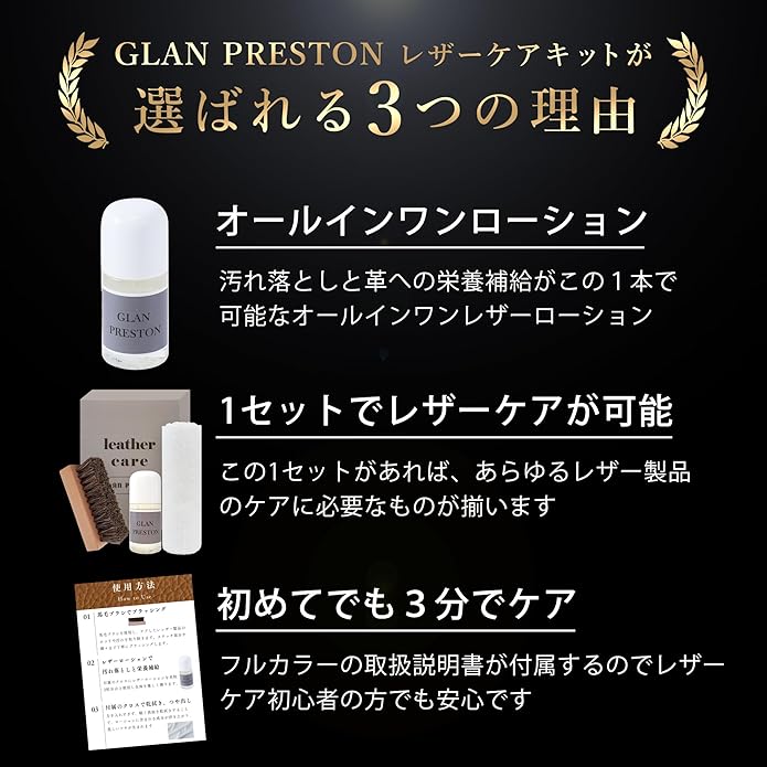 [GLAN PRESTON] [日本製オールインワンローション] 革製品のメンテナンス 革小物栄養保革クリーム レザーケアセット レザー製品のお手入れ バッグ ソファ 財布 ライダース 靴磨きセット簡易バージョン