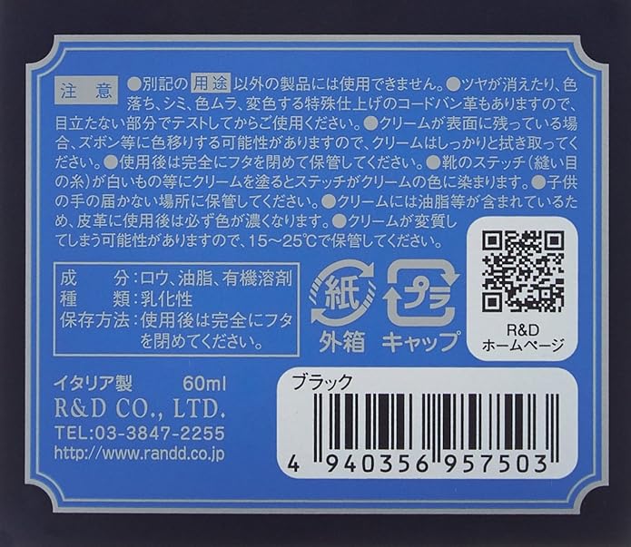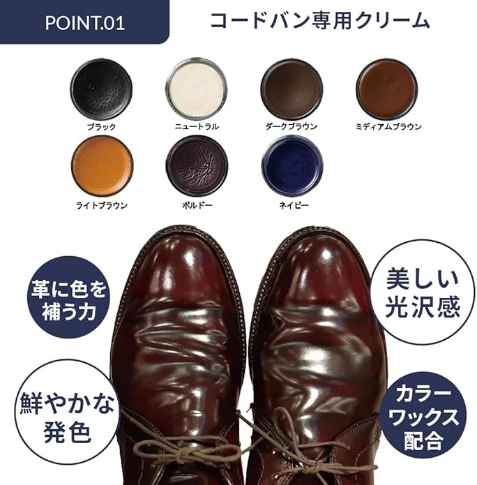 ・特殊なカラーワックス配合によりコードヴァンの色を鮮やかに蘇らせて補色します。・保革(栄養)効果や美しい光沢感を出すことでコードヴァンが本来放つツヤをしっかりと出します。着色力が強く革に色がうまく乗るので、ガラスレザー等の通常の乳化性クリームが浸透しにくい革の補色にもお使い頂けます。■用途:コードヴァン(コードバン)の補色・栄養・ツヤ出し、ガラスレザーの補色・ツヤ出し■タイプ:乳化性クリーム ガラスビン入り■容量:60ml ■原産国:イタリア製 ■カラー:全7色(ブラック・ニュートラル・Mブラウン・Dブラウン・Lブラウン・ネイビー・バーガンディ)■注意:用途以外の製品には使用できません。必ず目立たない部分でテストしてからご使用下さい。