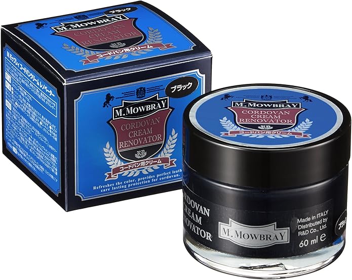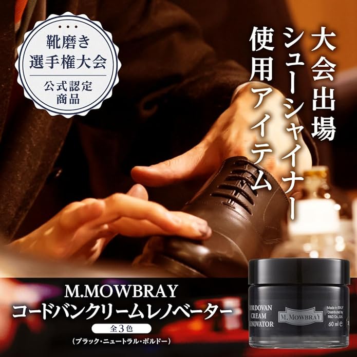 M.モゥブレィシュークリームは靴の歴史が長く、文化として根付いている欧州の伝統的製法とノウハウを今に伝える本格的靴クリームです。このシュークリームの特長は優れた浸透性により、潤いと栄養を与え、靴を長持ちさせる高い品質にあります。そして、同時に重厚感のある光沢、シルキータッチななめらかさと伸び、しっかりとした補色力といった使用感のよさとフィニッシュ(仕上り)が、プロや愛好家に支持され人気を博している理由です。製造は熟練の職人によって調合がなされ、さらにビンへの充てんも121つ彼らの厳しい目でチェックをしなが