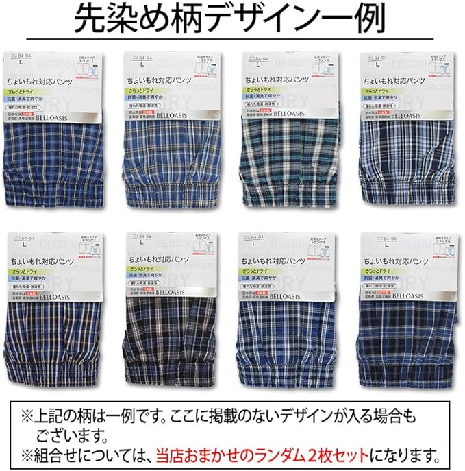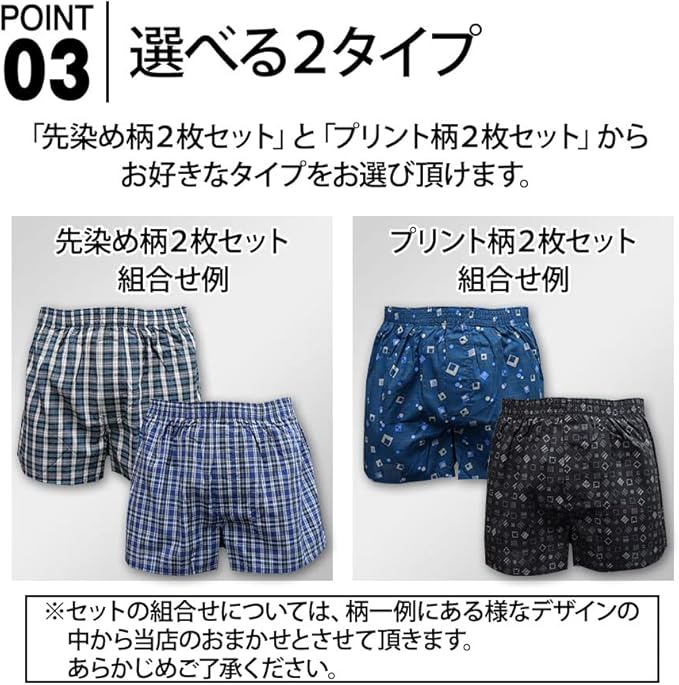 先染め柄2枚セット・プリント柄2枚セットからお好きなタイプをお選び頂けます。 いつも清潔で快適な履き心地です。