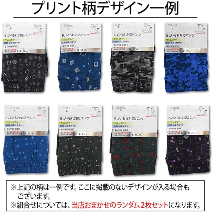 防水布に日本製の高吸収・高吸湿繊維BELLOASIS(ベルオアシス)を採用!ちょい漏れ対応の吸水性(約30cc相当)を有した綿100%生地のトランクス2枚組です。 ※防水布の色は入荷時期によって白か黒になります。お選び頂くことはできませんのでご了承ください。