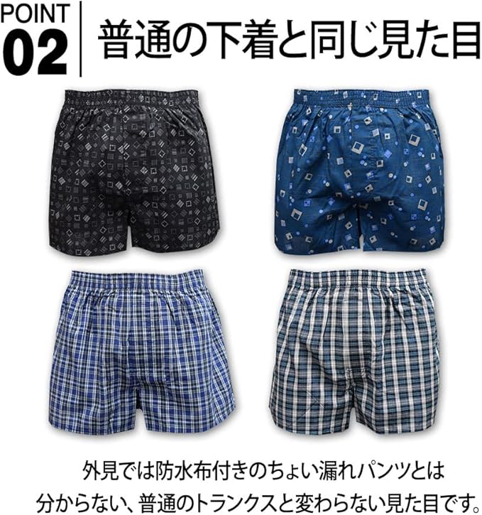 通常のトランクスと変わらない見た目なので、人目を気にせずお履き頂けます。