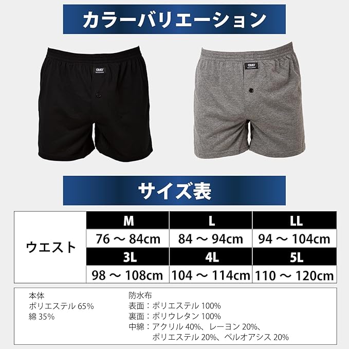 <サイズ>:M ウエスト76~84cm、L ウエスト84~94cm、LL ウエスト94~104cm、3L ウエスト98~108cm、4L ウエスト104~114cm、5L ウエスト110~120cm、 <素材>:本体 ポリエステル65%、綿35%、防水布、表面:ポリエステル100%、裏面:ポリウレタン100%、中綿:アクリル40%、レーヨン20%、ポリエステル20%、ベルオアシス20%
