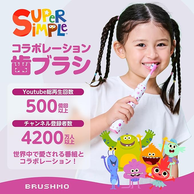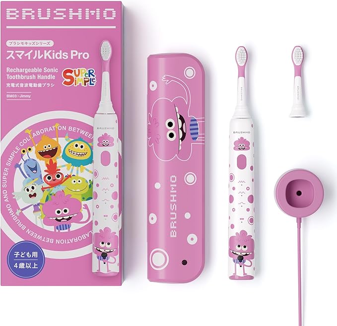 【東京都内の歯科医院にて取扱い開始】ブラシモ 除菌機能付き 電動歯ブラシ スマイルKids Pro 音波式電動歯ブラシ 総再生回数500億回以上 SuperSimple Song コラボレーション 子どもから大人まで使用可能 10代もハマるPOPデザイン Type-C 充電式 BM03