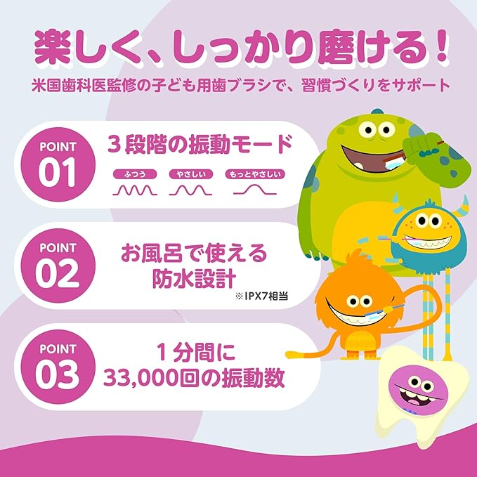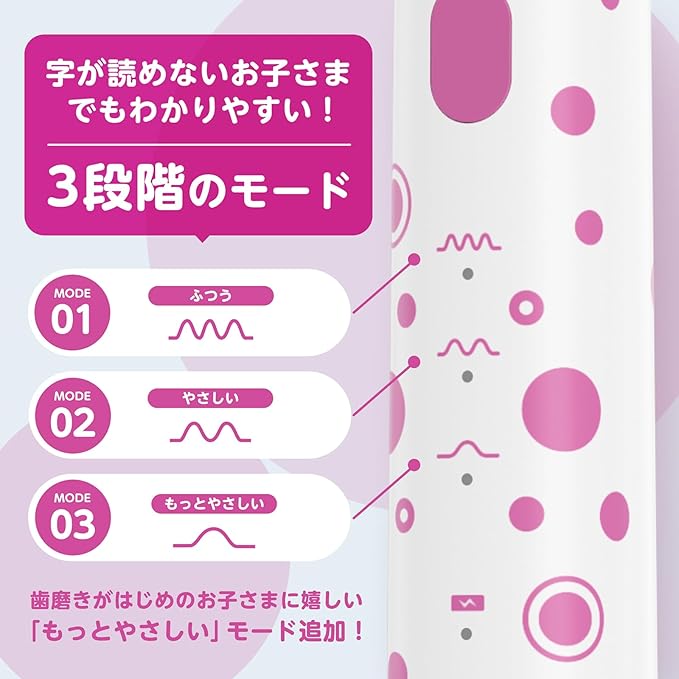特徴1:"もっとやさしい"モード搭載。歯磨きデビューのお子さまや、ご両親も安心。通常の“やさしい”モードよりさらにソフトな「もっとやさしい」モードを搭載しました。