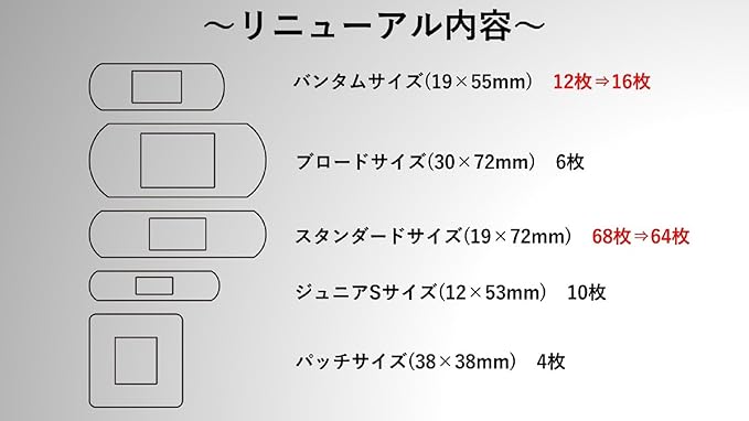 スタンダードサイズ(19 72mm)64枚、バンタムサイズ(19 55mm)16枚、ジュニアSサイズ(12 53mm)10枚、ブロードサイズ(30 72mm)6枚、パッチサイズ(38 38mm)4枚