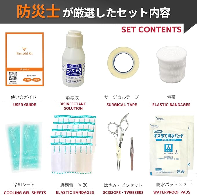 付属コンポーネント 内容品:救急ポーチ・三角巾・滅菌ガーゼ・防水パッド・絆創膏・冷却シート・綿棒・サージカルテープ・包帯・ポケットティッシュ・ハサミ・ピンセット・手袋型ゴミ袋