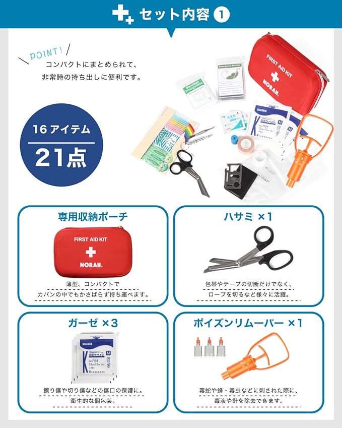 救急セット 救急箱 ファーストエイド 登山 応急処置 簡単操作 ポイズンリムーバー 21点セット NORAH