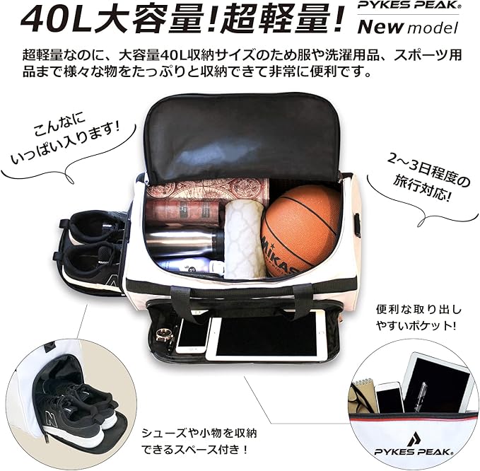 シューズが収納できる人気ボストンバッグ ✅ゴルフ・スポーツバッグ・ジムバッグとしても人気の高いボストンバッグ!約30Lの収納力はもちろん、ゴルフシューズやランニングシューズも収納できるシューズインポケット付き。ラウンド・試合や練習、飛行機にも持ち込めるサイズなので小旅行にも○PYKES PEAK限定商品でもおすすめの人気商品です。シューズポケットの内部仕切りはポリエステル素材になっており、シューズを入れていない場合のメインルームの収納の妨げになりません。収納力を潰すことなく最大限に荷物を収納できます。
