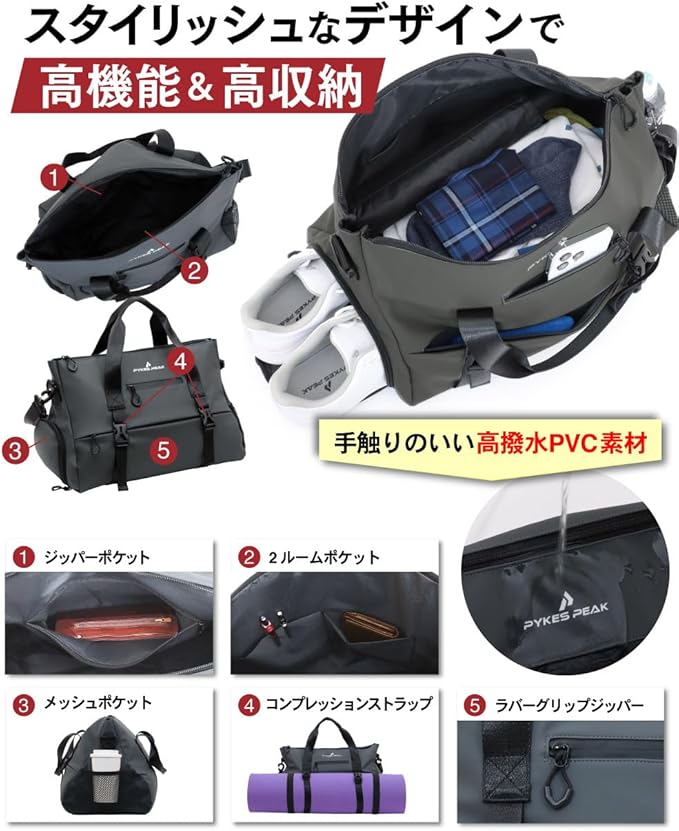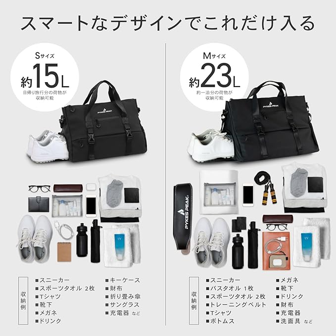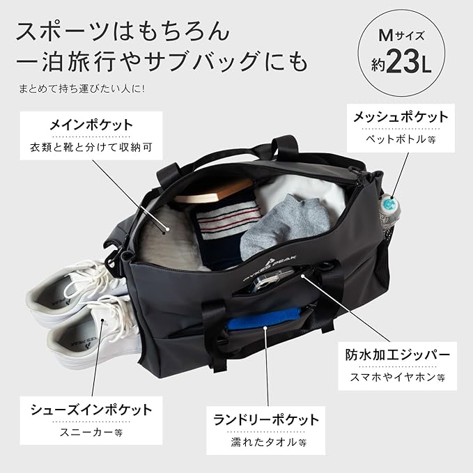 PYKES PEAK(パイクスピーク) スポーツショルダーバッグ エナメルバッグ 3WAY 23L 大容量 ジム ゴルフ アウトドア スポーツ ランニング 旅行 出張 バッグ ショルダー 【ブラック Mサイズ】