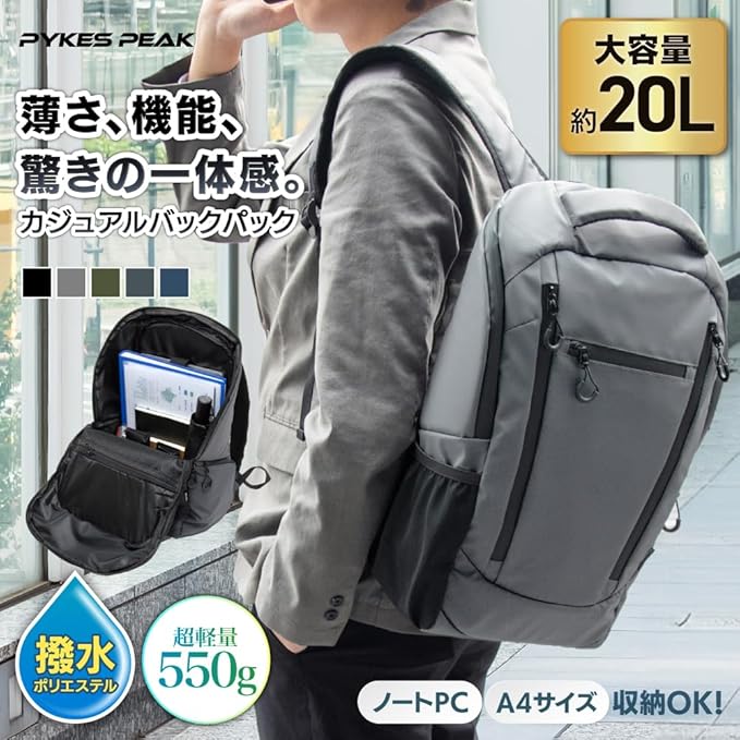 PYKES PEAK(パイクスピーク) リュック バックパック リュックサック 【薄型 撥水仕様 PC収納 背中 通気性 キャリーオン】 A4 20L 軽量 通勤 通学 旅行 ビジネス メンズ レディース カバン デイバッグ (ネイビー)