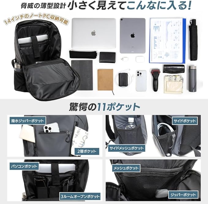 ✅【満員電車でもかさばらない、薄型軽量設計】本体重量はわずか約550gと、500mlペットボトル1本分ほど。軽量でありながら機能性をしっかり備えた設計で、長時間背負っても疲れにくく、毎日の通勤・通学に最適です。さらに、厚みを抑えたスリムなフォルムにより、混雑する電車やバスの中でも他人にぶつかりにくく、ストレスの少ない使用感を実現しています。背負ったまま移動する場面が多いユーザーにとって、体の動きに自然に馴染む快適性が魅力です。