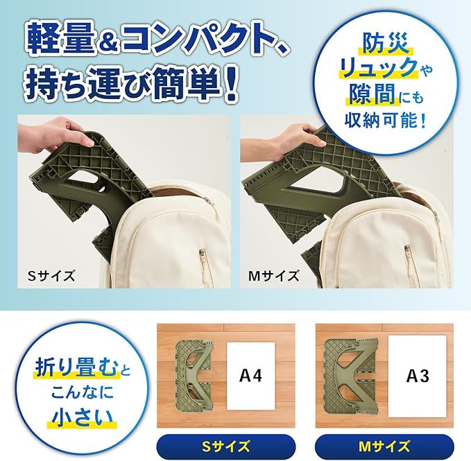 ✅【軽量&コンパクト設計、持ち運びもスムーズ】Sサイズ:約0.75kg/Mサイズ:約1.54kgと非常に軽量。折りたたむとスリムな形状になり、車のトランクや収納スペースにもスッキリ収まります。携帯トイレとして、アウトドア・キャンプ・車中泊などのレジャー用途にも便利。緊急時だけでなく、日常でも使える防災グッズです。