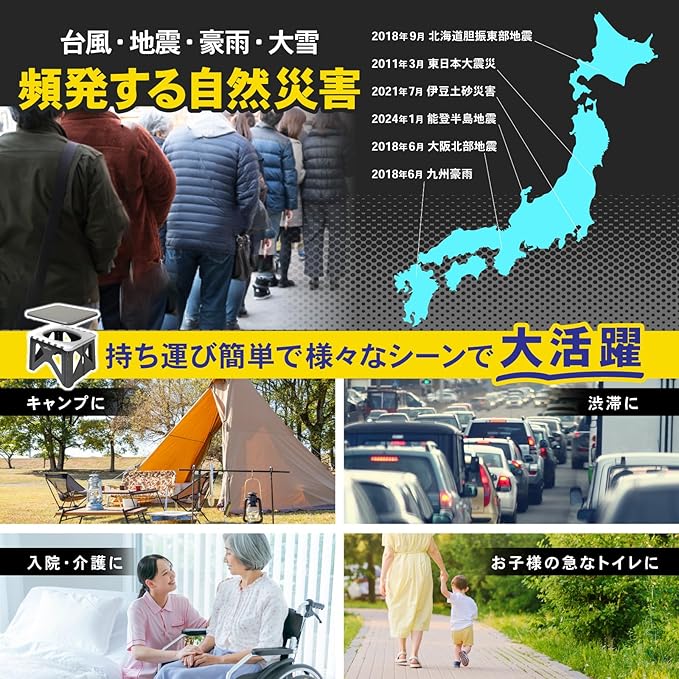✅【1台4役の多機能仕様で日常にもなじむ】トイレ以外に、イス・踏み台・ゴミ箱としても活躍する多機能タイプ。非常時だけでなく、普段使いやアウトドアでも使えるフェーズフリー設計。おしゃれなデザインで室内にもなじみ、災害対策用品とは思えない使い心地です。非常用トイレとしてだけでなく、幅広いシーンで活用できます。