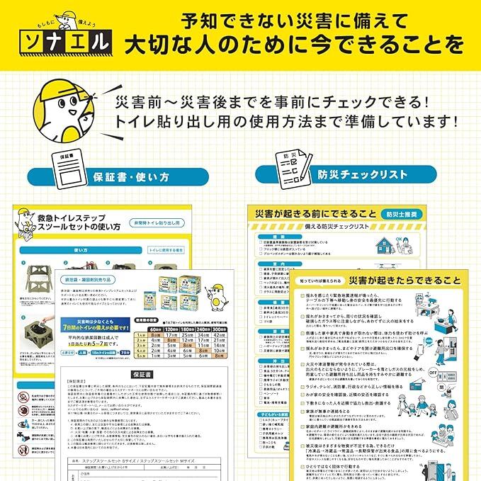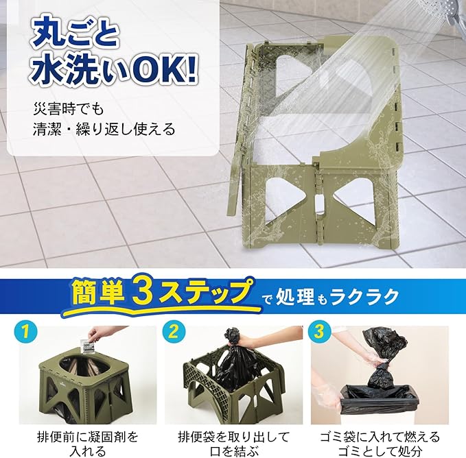 ✅【すぐに使えるセット内容&使いやすさ】排泄袋6枚、凝固剤6個、収納バッグに加え、役立つ防災チェックリストも付属。セットが簡単で、スムーズに使用できる設計です。プラスチック製で丸洗い可能な本体は、使用後も清潔な状態をキープ。耐荷重100kgの丈夫な構造で、成人男性でもしっかり使用できます。用途に合わせて選べるMサイズとSサイズを展開。